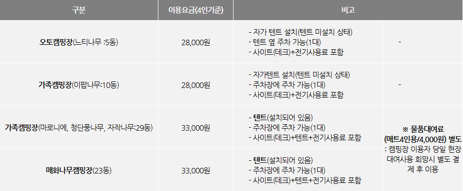 - 캠핑장 이용기간: 매년 3월 1일 ~ 11월 30일(12월 ~ 다음해 2월 휴장)